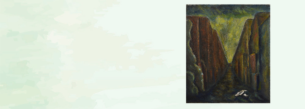 Vengono in mente, trasposte in termini visivi, le parole chiave di un male di vivere con premesse ottocentesche ma con forti espressioni novecentesche. In molti quadri spopolati e deserti, soltanto un foglio bianco accartocciato in terra, suggerisce l’avvenuto passaggio, di una persona dall’identità misteriosa, dall’itinerario ignoto, dallo scopo sconosciuto. Potrebbe essere un poeta che abbandona i propri versi stanco di essi o speranzoso di aver dei lettori….